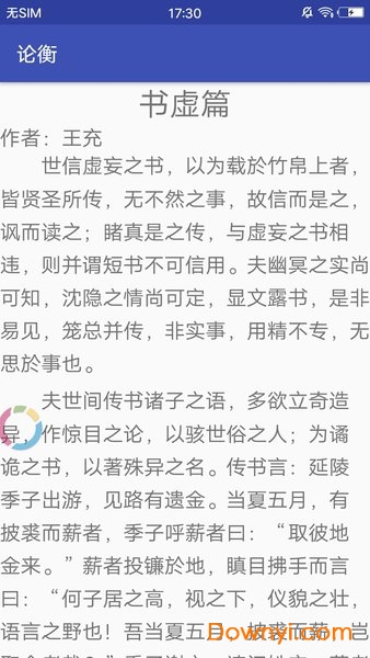 论衡手机版是一款非常不错的书籍阅读软件,里面收录了论衡的古典文学著作,让喜欢古典文学的朋友可以在里面免费阅读;内容非常的齐全,阅读界面也是非常的干净简洁,很是不错。欢迎大家来体验!
