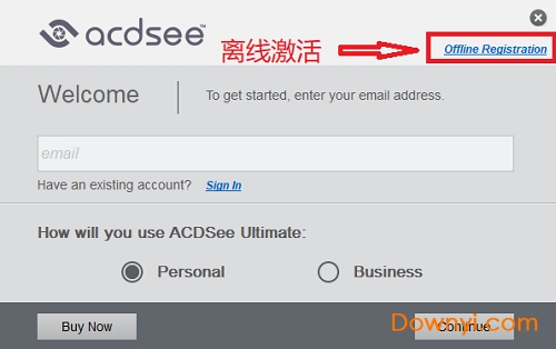 2、打开acdsee2019,会自动弹出注册验证的窗口,如图所示,离线激活;