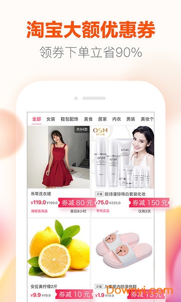 时尚服饰鞋包、美食、新鲜水果、潮流彩妆化妆品、品质又划算的居家用品、一线大牌、聚划算商品、淘宝月销过万商品,都能在这里领取优惠券