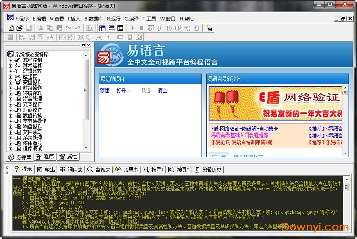 由易语言汉语编程推出的易语言编辑器工具,是个支持基于汉语字、词编程的、全可视化的、跨主流操作系统平台的编程工具,支持与常用的编程语言互相调用,具有充分利用api,com、dll、ocx组件,各种主流数据库,各种实用程序等多种资源的接口和支撑工具。有自主开发的高质量编译器,除了支持界面设计的可视化,还支持程序流程的即时可视化,现有各种支持库多达40多个,用户可以使用她来满足几乎所有的windows编程需求,多媒体功能支持强大,完善的网络、端口通讯和互联网功能支持。易语言除了支持界面设计的可视化,还支持程序流程的即时可视化;除了语句的中文化之外,还专门提供了适合中国国情的命令,如中文格式日期和时间处理、汉字发音处理、全半角字符处理、人民币金额的处理等;综合采用了结构化、面向对象、组件、构架、集成化等多种先进技术,并在运行效率、性能价格比、全可视化支持、适应本地化需要、面向对象以及提供windows,linux上的运行平台等具有特色。