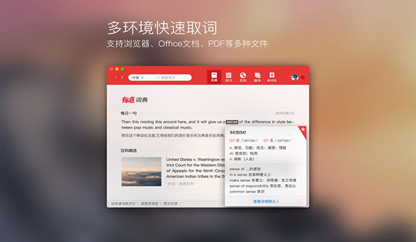 有道词典Mac版作为一款英语、日语、韩语、法语免费全能查词翻译软件,有道词典在多年来致力于为用户提供更优质的翻译服务,针对Mac平台特性,我们特别推出全新的版本,更符合Mac用户翻译使用习惯。发布多年以来,成为Mac系统下必备的词典软件,在同类软件排行位居前列。