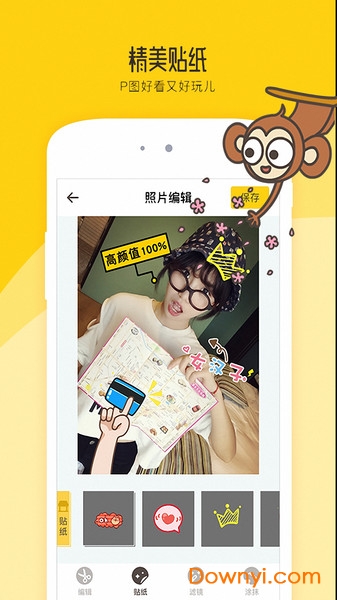 一百多位专业插画师每周更新!千余种款式*使用!配合*全面的滤镜、裁剪、涂抹、美颜、微调编辑功能,让你的照片好看又好玩儿!