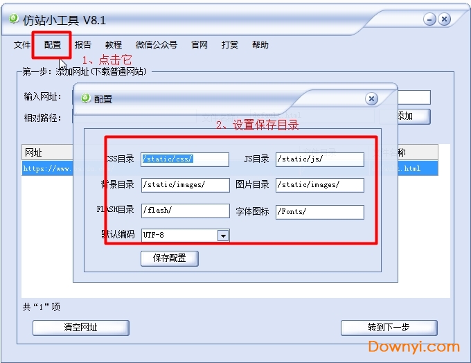 点击菜单栏的“配置”,选择下载的静态文件保存目录。