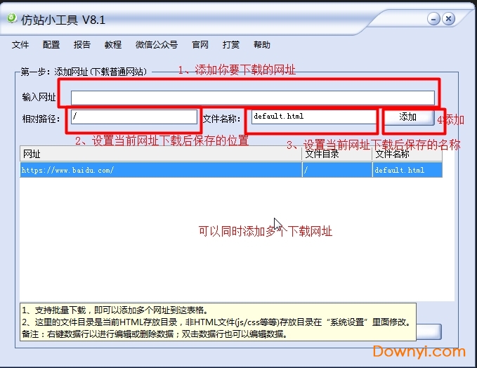仿站小工具是通过网址下载静态网页的工具。从输入的网址下载html代码,提取出JS、Css、Image、Picture、Flash等静态文件网址,再从下载完好的Css代码中提取出Image静态文件网址,通过网址下载静态文件,根据软件设置好的保存规则,自动修正html和css代码链接路径,最终这些静态文件被按分类保存到电脑文件夹。