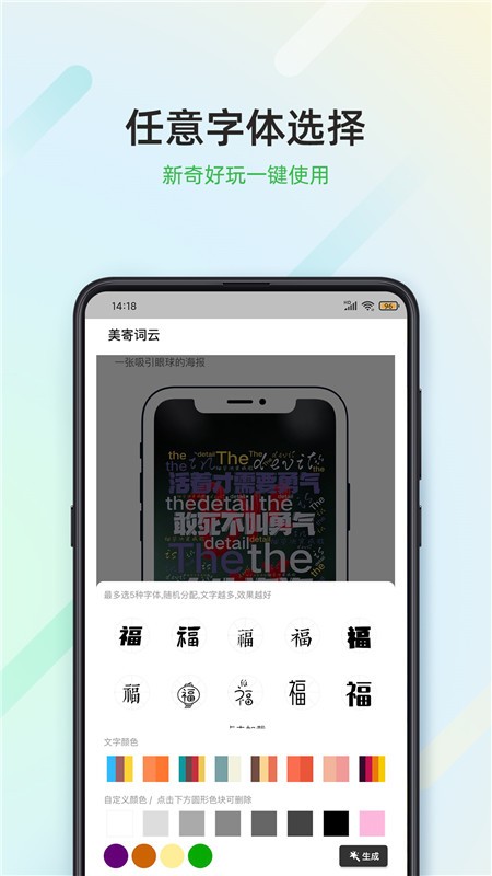 用户可以自行搭配。字体的设计对于一些朋友来说是比较难的,用户可以一键选择,根据上面的字体来获取自己的灵感。
