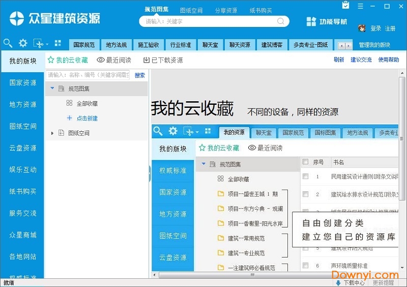 1、平台的功能版块包括国家规范、国标图集、施工验收、注册考试、行业标准、地方法规、地区图集、省标图集、法规公告、图纸空间、云盘资源、专家答疑、建筑书城、众星商城等;