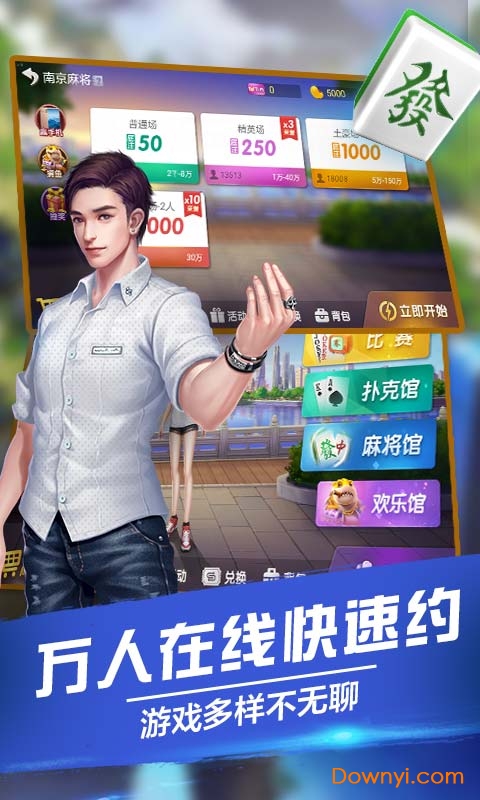 南京麻将起源于江苏地区,游戏规则:可碰杠,不可吃,比下胡,带庄。除一般番型外,特色玩法如七对、全球独钓、天胡、无花果等,富有别致趣味性。除了传统的碰、杠、和牌等规则外,经过创新,增加了“包场”、“现场彙 ”等特色元素。南京麻将以其独特的玩法,刺激的游戏规则得到全国各地麻友的推崇!