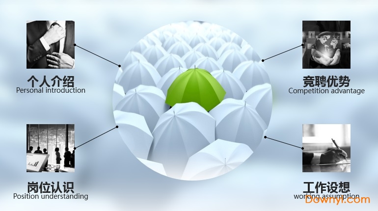 幻灯片模板使用了在一堆白雨伞中的的一把绿雨伞作为背景图片,凸显了与众不同的自己,这是一个有创意的构图。个人求职PPT模板内部,使用了绿色扁平化设计风格,制作了介绍自己的PPT图表等。