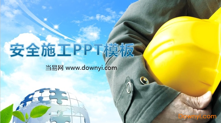 蓝天白云下,以为手持安全帽的工人作为PPT模板的背景图片。背后是拼图构成的地球模型和城市建筑,以及青青的绿草地。本幻灯片模板非常贴近安全管理、安全施工的主题,适合用于制作安全相关的幻灯片课件。