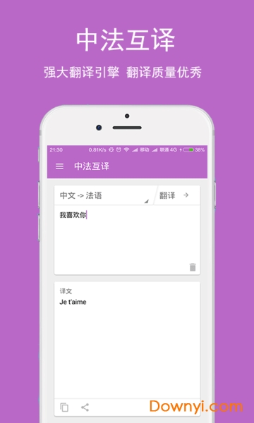 有点浪漫的法语翻译应用。全新领先的翻译引擎,让中法互译变得更加可靠有保证。会听话的语音翻译,法语翻译也可以么么哒,乐趣无穷也。新增旅游攻略,想去法国的朋友可以先涨涨知识。另外还专门提供了贴心的翻译历史纪录、译文一键复制、分享给好友的功能。界面设计简洁、优雅,体积小巧,只有1m+,但是功能很强大哦。赶快下载来试试吧~