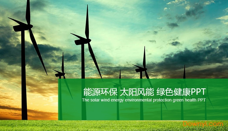 封面为高速公路旁边的草地和风车群作为背景图片,与清洁能源主题搭配。powerpoint模板内容页面,由22张绿色扁平化幻灯片图表制作。