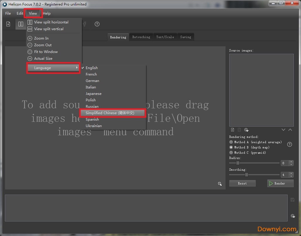 2、“渲染”选项卡是Helicon Focus的起始点和主要工作区,这里用于打开源文件,设置焦点堆叠参数,启动渲染并预览结果,图中排列了各项工具栏的位置。