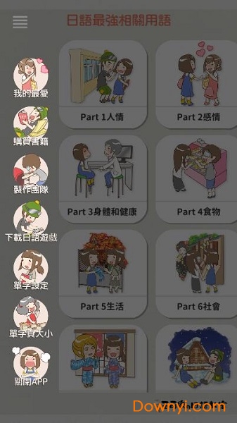 本APP共分成八个主题:人情、感情、身体和健康、饮食、生活、社会、娱乐和旅游、颜色和自然,涵盖日常生活的每个面向,天天用得到的日语单字和短句。对于刚学日语的人,或是已经有一定程度的人,都是最棒的日语相关用语学习工具!
