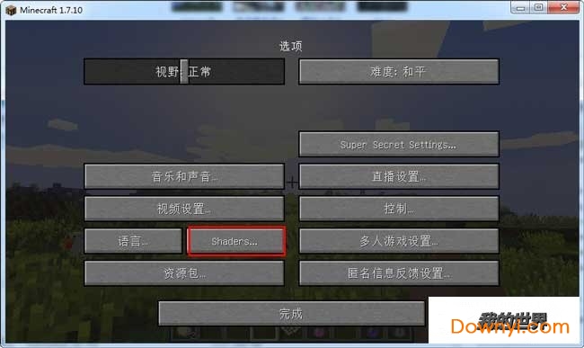 2.进入游戏,按ESC--选项--Shaders...进入光影MOD设置界面。