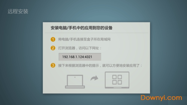 进入后,你会得到远程安装的步骤提示,安装图上的提示操作即可,但是记得其他的设备需要与电视在同一个网路环境中哟~