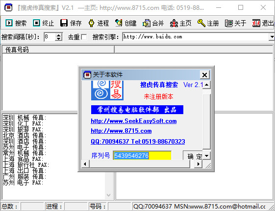 国产简体中文版专业通过百度、谷歌、搜搜、雅虎等搜索引擎快速搜集大量目标公司企业客户传真号码搜索工具。这些顶级搜索引擎收录了全世界的中文网页,输入与传真号码相关的字符即可检索到大量的传真号码,而且这些号码都是活跃的、有效的,具有极高的市场营销价值。