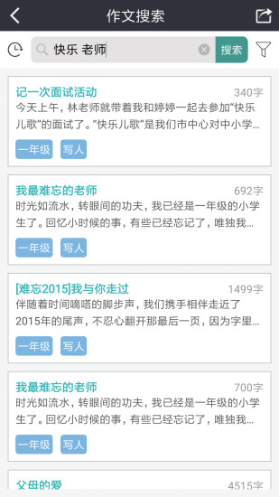 【查找】可按年级、体裁、话题分类、字数等要求来查找作文,也可以多个关键字搜索作文;