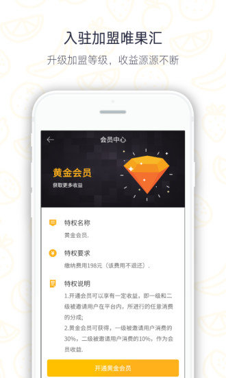 入驻加盟:升级加盟等级,积极邀请好友加入唯果汇,收益源源不断。