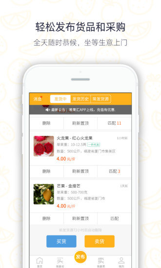 我要卖:帮助卖家找到好买主,并保障水果交易过程的快捷、安全与高效。