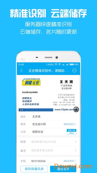 高速、准确、无需付费的名片识别手机软件。名片识别过程全部自动化,用户只需拍名片即可。