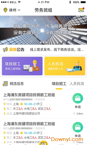3、全国项目任你调,可通“大吊车劳务app”发布项目信息(包括:项目名称、施工地点、施工部位、所需工种、工期、gps定位等),使用筛选已通过认证合格的分包商或施工人员。