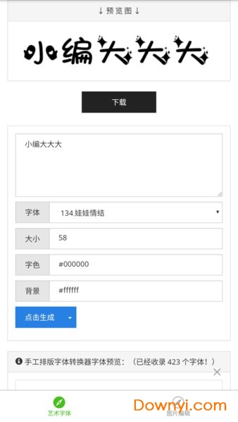 很简单也很有趣的一款字体小工具,无广告,整个操作的过程以及步骤都比较的简单,目前支持的功能还蛮多的,拥有艺术字体以及图片编辑功能,支持的字体选择以及背景颜色的素材比较的多,而且操作很简单,一键就可以快速生成,还支持保存。