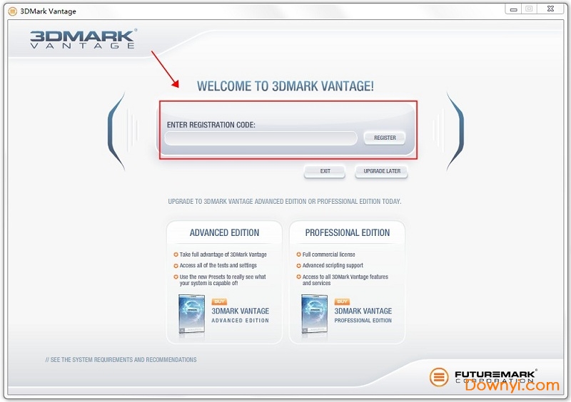 1、我们运行3dmark vantage,进入如下的界面,需要对软件进行注册。