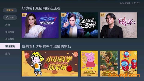 首页采用抽屉式导航设计,依次分为“开通vip”“搜索”“我的”“重磅推荐”“精选策划”以及“分类”六大类。突出重点“重磅推荐”“会员专区”等重点视频内容,使得首页整体观感尤其简约大气。在查找相关内容时,能迅速定位至想要的视频。