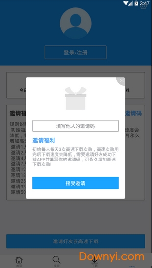 2、每个新用户每天有3次利用黑科技加速下载的机会,加速效果视具体资源的情况,邀请其他用户安装可以永久增加加速下载的机会。