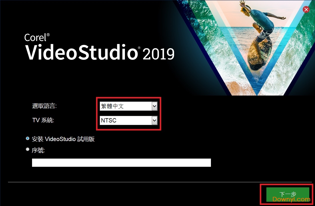 2、双击exe文件安装,目前只有繁体中文,英文,日语之类,tv系统可选择ntsc和pal,如果你购买了会声会影2019旗舰版64位序列号,可以输入序列号安装,否则只能选择试用版这个免费版本使用;