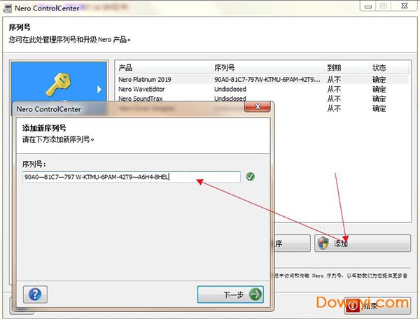 2、点击“添加”将序列号“90A0-81C7-797W-KTMU-6PAM-42T9-A6H4-8HEL”复制到软件上并点击“下一步”