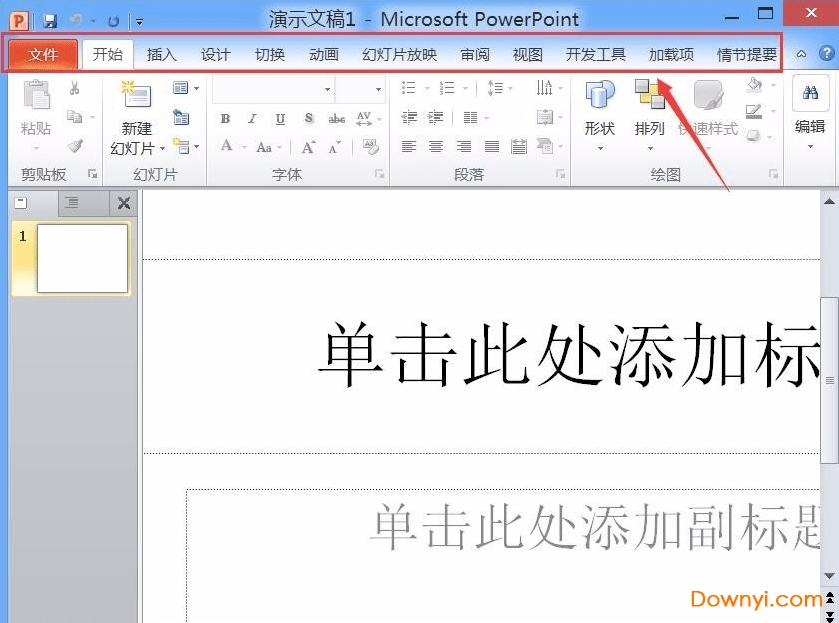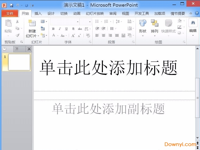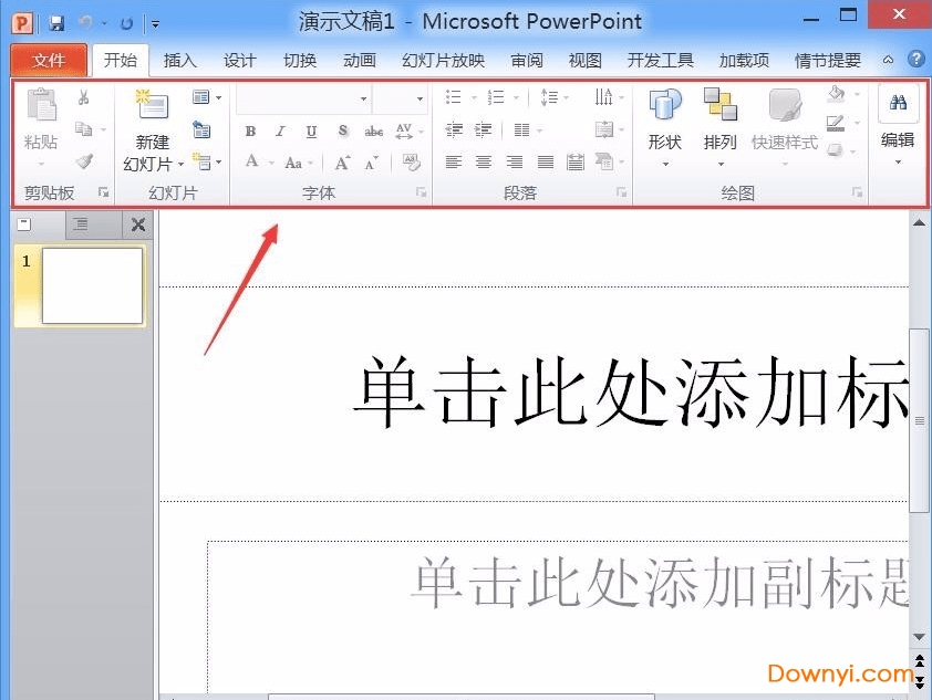 2、我们ppt2010软件界面的最上方可以看到演示文稿1的标题。这个是你ppt文档的名称,你可以进行修改