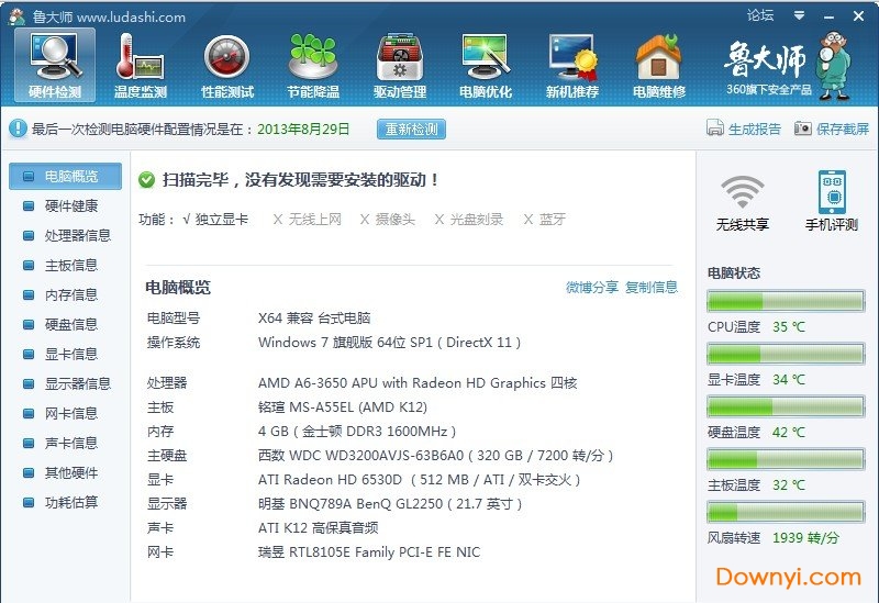 鲁大师2013免安装版为你的电脑提供比较方便的硬件监控功能,让你可以实时知道你的硬件所处的状态,让你的电脑更好的使用这些硬件。软件功能也是比较不错的,跑分、硬件降温等都有,给你最实用的工具。