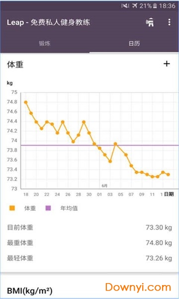 你可以用软件中的日历记录运动进度,作为坚持运动的动力。此外,你可以在体重图上查看体重变化。
