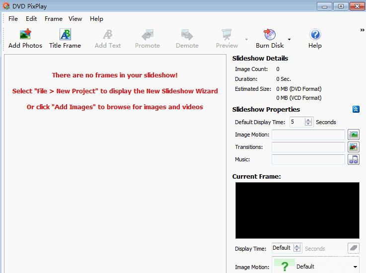 DVD PixPlay 能够将数码照片制作成自动秀图的 VCD,它没有太多复杂的选项,操作起来非常简便,可以单独设定图片显示秒数、可以插入 MP3、WAV 背景音乐、可以加入标题文字。