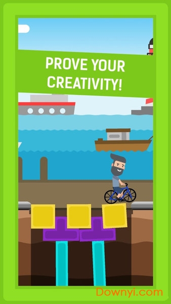 2、玩家需要巧妙进行组合多种积木,尝试打造坚固的桥梁,实现角色可以骑车前进成功。