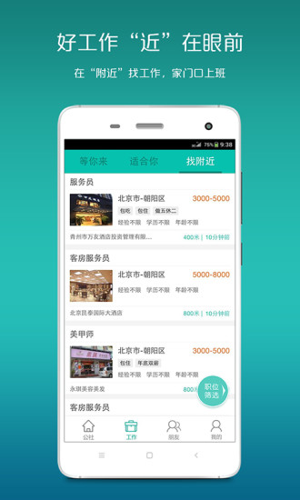 2、按距离呈现职位,在“附近”找工作,在家门口上班