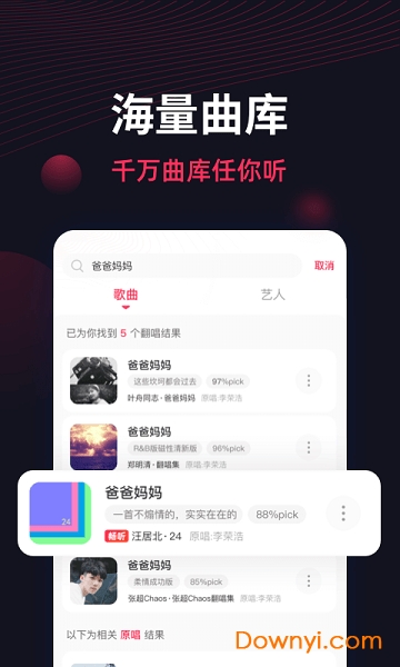 1、拥有独特的翻唱排行榜,用户可以听到比原唱更好听的翻唱音乐;