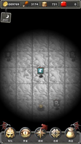 界面自带一个摇摆的时钟,白天节奏比较平和,敌方军团都是固定不动,玩家可以用侦查功能查看对手信息,再决定是否进攻。黑夜降临后,会随机在旷野上生成移动的不死军团,可攻击玩家。在夜晚时间,玩家不能侦查和填海。
