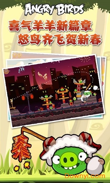 这是一款风靡全球的物理解谜游戏。游戏中小鸟们为了报复偷走鸟蛋的猪,鸟儿以自己的身体为武器,攻击猪们的堡垒。。在新的篇章里,烟花灿烂的夜空搭配喜庆的鞭炮、灯笼,到处都充满着浓浓的新年氛围,然而捣蛋的小猪披上了羊毛,带上了羊角帽。同时全新的炸弹黑鸟将会登场,它们拥有强大的地磁波力量,能够制造出强大的电场,然后释放威力无比的冲击波! 快快加入我们的游戏吧!