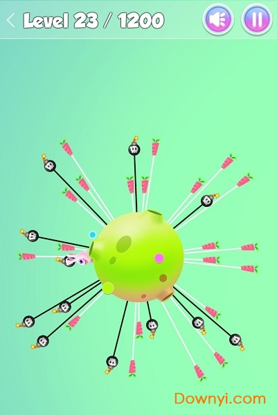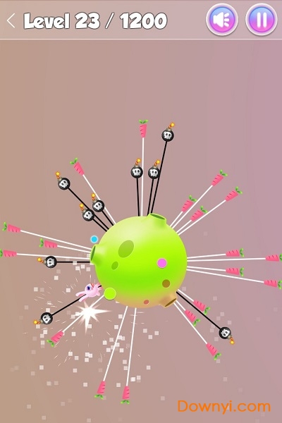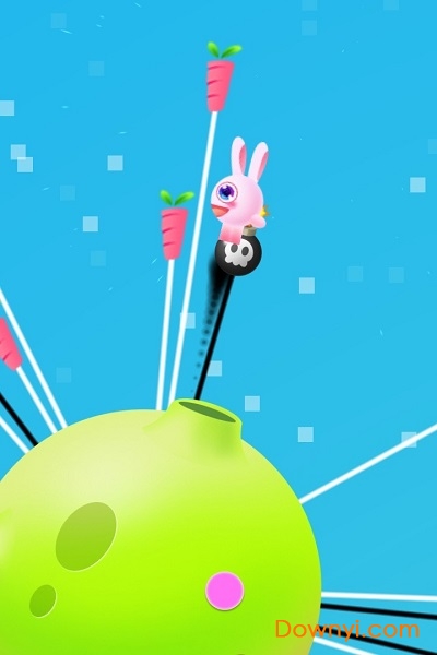 在旋转的球球上,同时存在炸弹和胡萝卜,你需要操控兔子跳起来吃掉胡萝卜,同时避开炸弹,1200关!