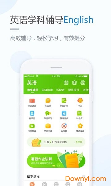 课本点读、练口语、作业辅导、绘本课程、考试测评、早读课程、课前预习、阅读训练、语法训练、听力训练、每日英语、老师作业、精选收藏、听力、词典、单词听写