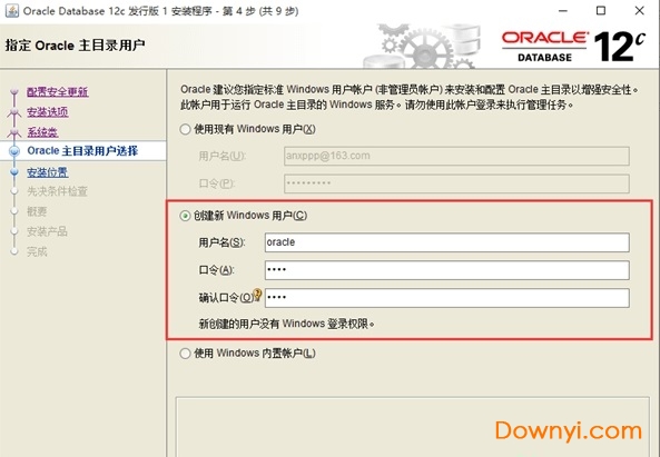 5使用现有的windows用户:如果选择该项,则需要指定没有管理权限的用户。创建新windows用户:创建一个新用户,输入用户名和密码,确认密码。使用windows内置账户选择该项:内置账户,oracle也建议使用权限受限的账户。