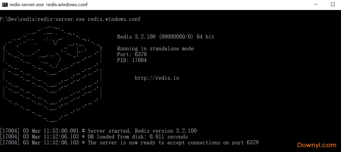 1、将下载的软件压缩包解压到redis文件夹下,并将其拷贝到索要存放的位置,比如说我的是f:\dev\redis,在该文件夹下按住【shift】+鼠标右键,调出cmd控制台,运行redis-server.exe redis.windows.conf,如下图所示: