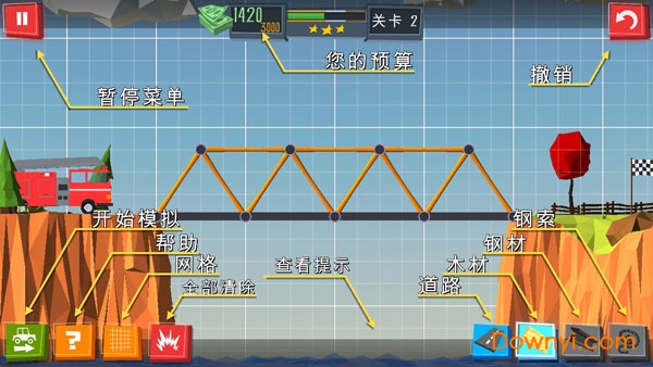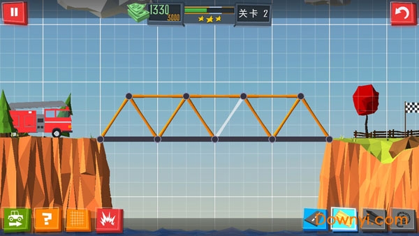 游戏中关于建造时用到的材料也非常的具有多样化,从建筑钢材到轻量级的木材加固,不同类型的建筑材料混合,可以减少你的道路修建成本,进而对于玩家三星通关也起到至为关键的作用,待建造完成以后,你还需对桥梁进行压力测试检验,看它们能否支撑从上面通过的汽车或卡车重量,简单的图形模拟,却也包含了不同级别的挑战难度。