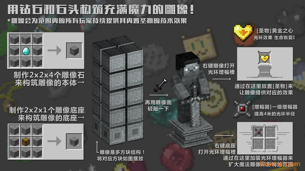 我的世界魔法雕像模组是一款全新制作的我的世界mod,主要是属于魔法类的mod,玩家安装之后将会获得拥有多种增益效果的雕像,感受魔法的神奇,需要的朋友欢迎来下载!