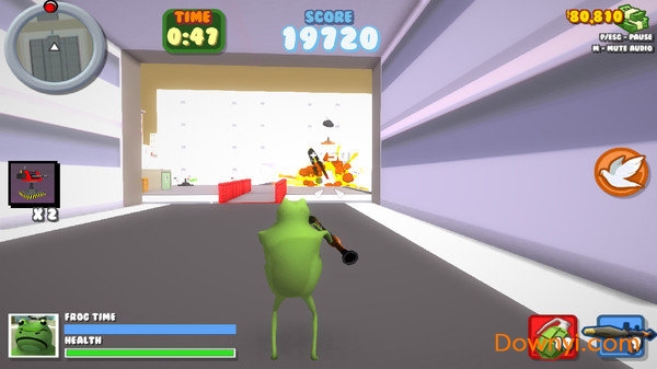 2、青蛙的任务很多,它不仅要和地面的人战斗,还要炸毁车辆,炸毁直升机,甚至是炸毁敌人的炮台,敌人死后青蛙能收集大量金币和武器,还有能补充体力的医疗包;