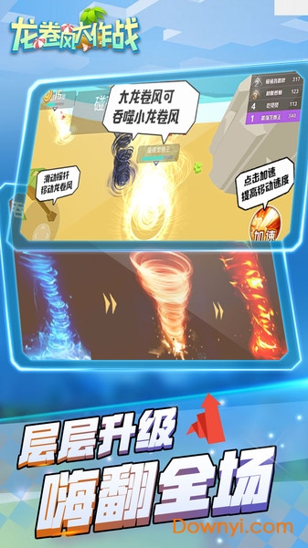 该游戏玩法独到,画面休闲清新,各种各样的挑战场景将会给予玩家更多的游戏体验,而玩家只需在游戏中操控拥有加速能力的龙卷风去吞噬挡在他们面前的障碍物即可,随着游戏时间的不断缩减,你要在限定的时间内,完成对龙卷风的成长,成长起来的龙卷风不仅在体型上拥有较大变化,而且在威力上也会变得越来越强,吸食场景中对应物品能够让你在最短的时间内得到最大程度上的成长,轻轻松松撕裂你面前的所有敌人。此外,在龙卷风大作战中还拥有各种各样的龙卷风皮肤以及底座,其鲜艳的色彩和炫酷的特效,能够让你在这个激烈竞争的过程中的到赏心悦目的舒适感,同时简单的操作玩法,在你在较短的时间内快速熟悉整套的游戏操作。
