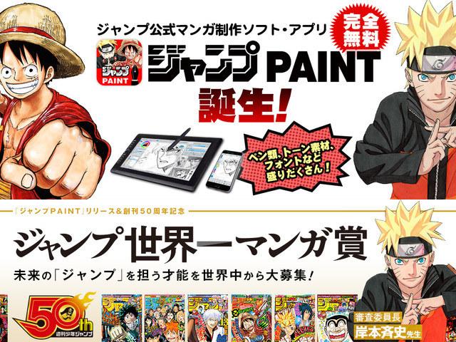 「JUMP PAINT」是可以在PC、平板电脑、手机上免费画漫画的绘画工具。可以免费使用笔刷、色调、字体等素材。还搭载了部分「周刊少年jump」中实际使用的字体。同时也具备网络投稿和参加「少年JUMP 新人王」的功能,通过该软件绘制的作品可以直接投稿。