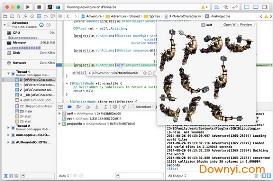 您可以直接在源码编辑器中调试应用程序。通过在变量名称上移动鼠标来查看对象的内容,然后使用quick look来检测某个特殊值。调试区和调试导航器可让您在检查代码的时候谨慎地控制应用程序的执行。对于更加精细的控制,控制台会提供命令行来访问调试器。